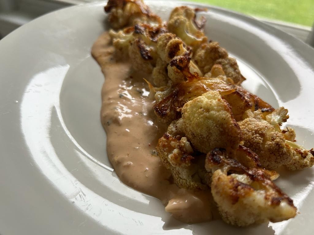 We made dinner at home. This was an Asian-inspired salmon meal. Roasted Salmon with Yum Yum Sauce, Collard green Egg