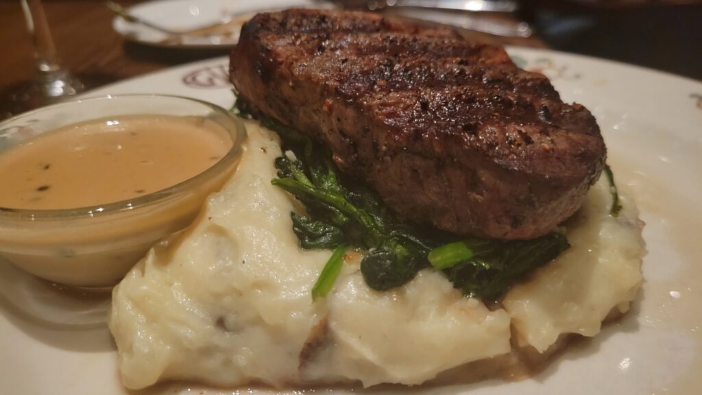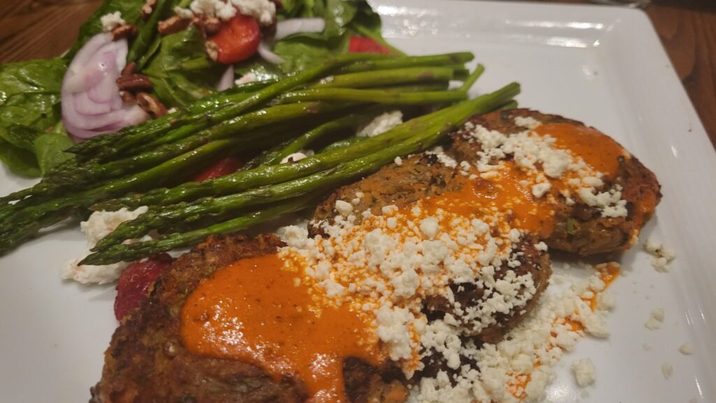 I had Lentil Patties with veggies, he had steak and potatoes. I would go back for the appetizers. I don’t see wine or dessert in the pics, but I am pretty sure we had some.